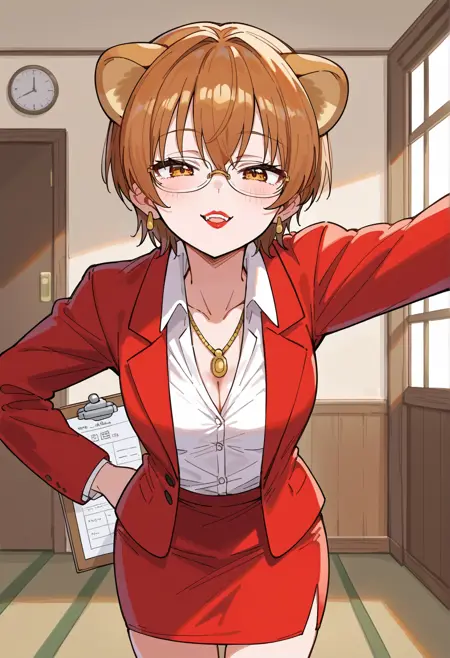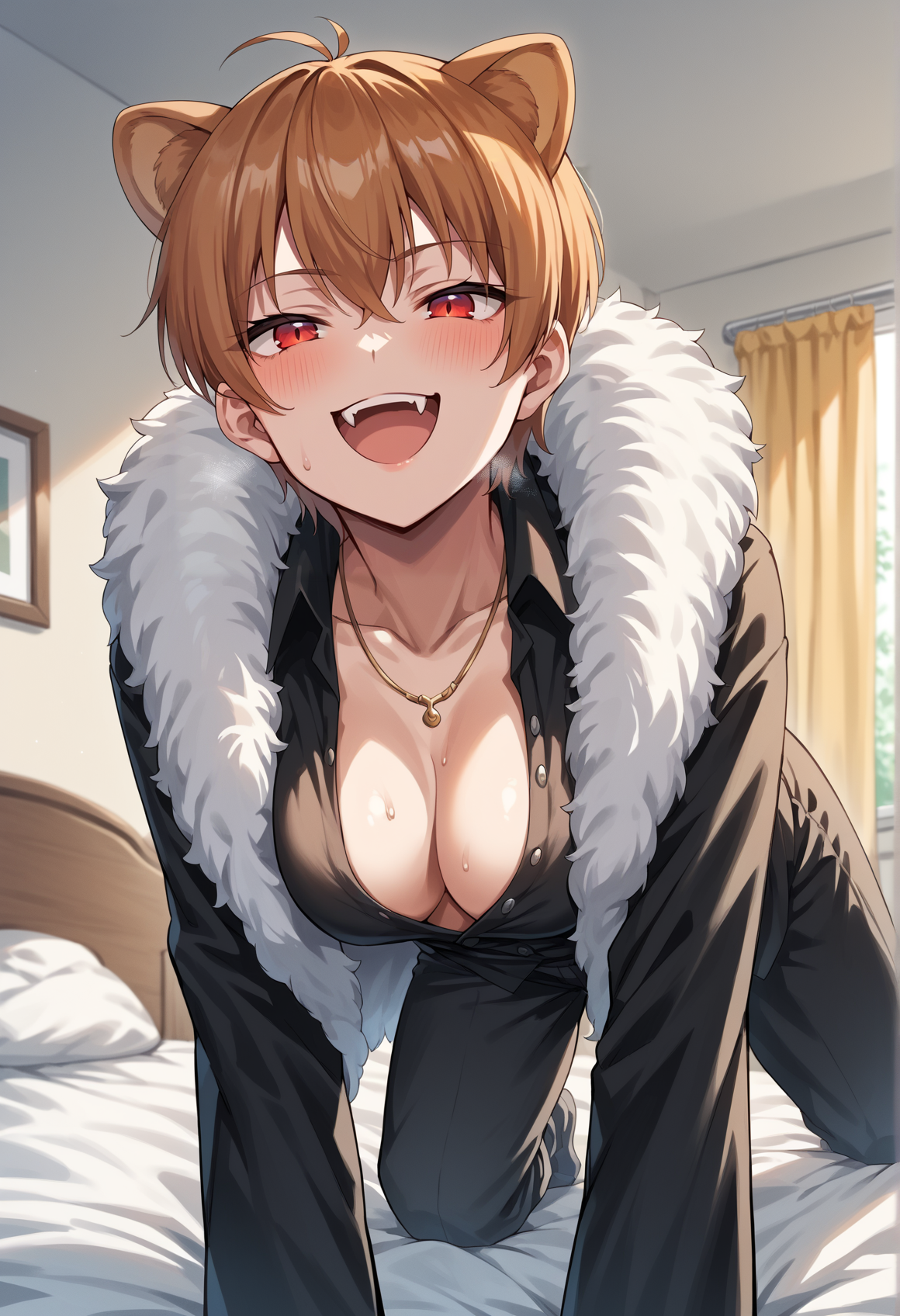 Asc3:ショートヘア、茶色の髪、赤い目、動物の耳、黒いシャツ、ファーのトリム、ネックレス、コート、黒いズボン、開いた服装、胸元