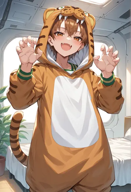 Asc1:ショートヘア、茶色の髪、茶色の目、動物の耳、動物の衣装、虎の尾、動物のフード、フードをかぶっている