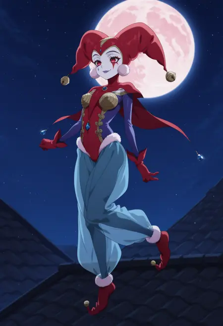 注目タグ:赤い目、顔のペイント、道化師、道化師の帽子、レオタード、短いマント、鈴、手袋、青いパンティーストッキング、透け感のあるハーレムパンツ、ハーレムパンツ、毛皮のトリム、ポンポン(服)、赤い靴