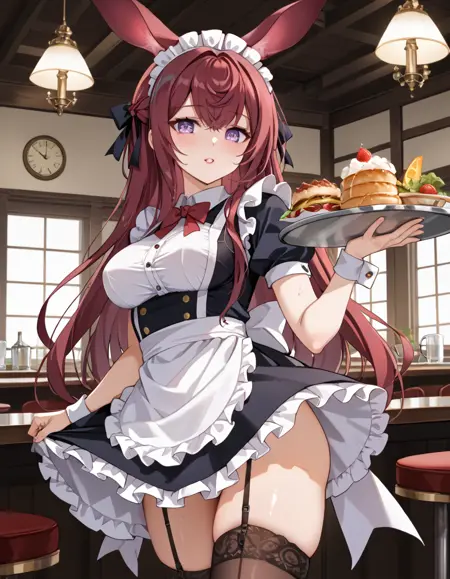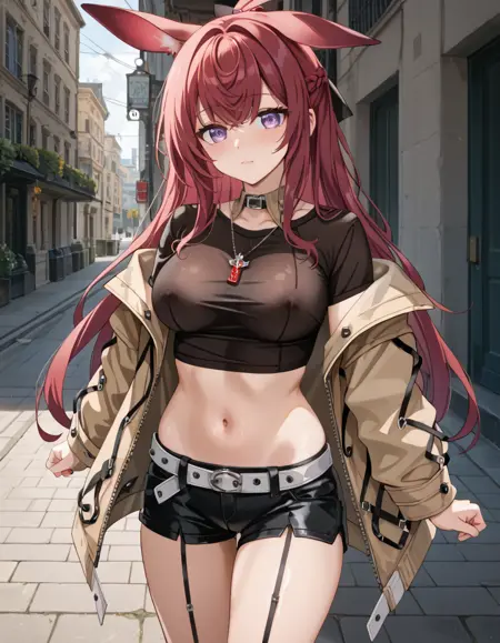 Ray, long hair, red hair, purple eyes, rabbit ears