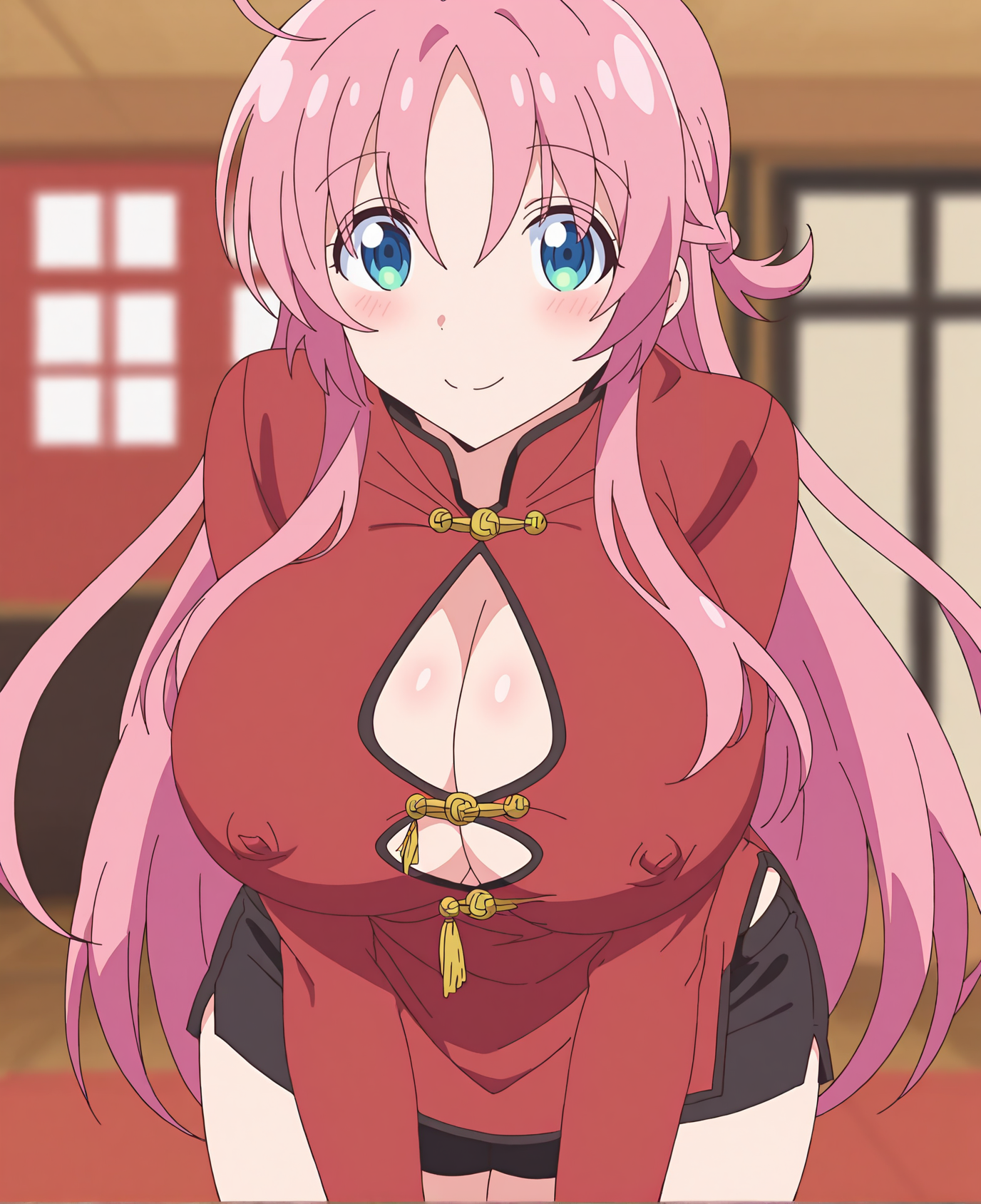 衣装カットアウト、中国風衣装、胸元カットアウト、勃起した乳首、黒いショートパンツ