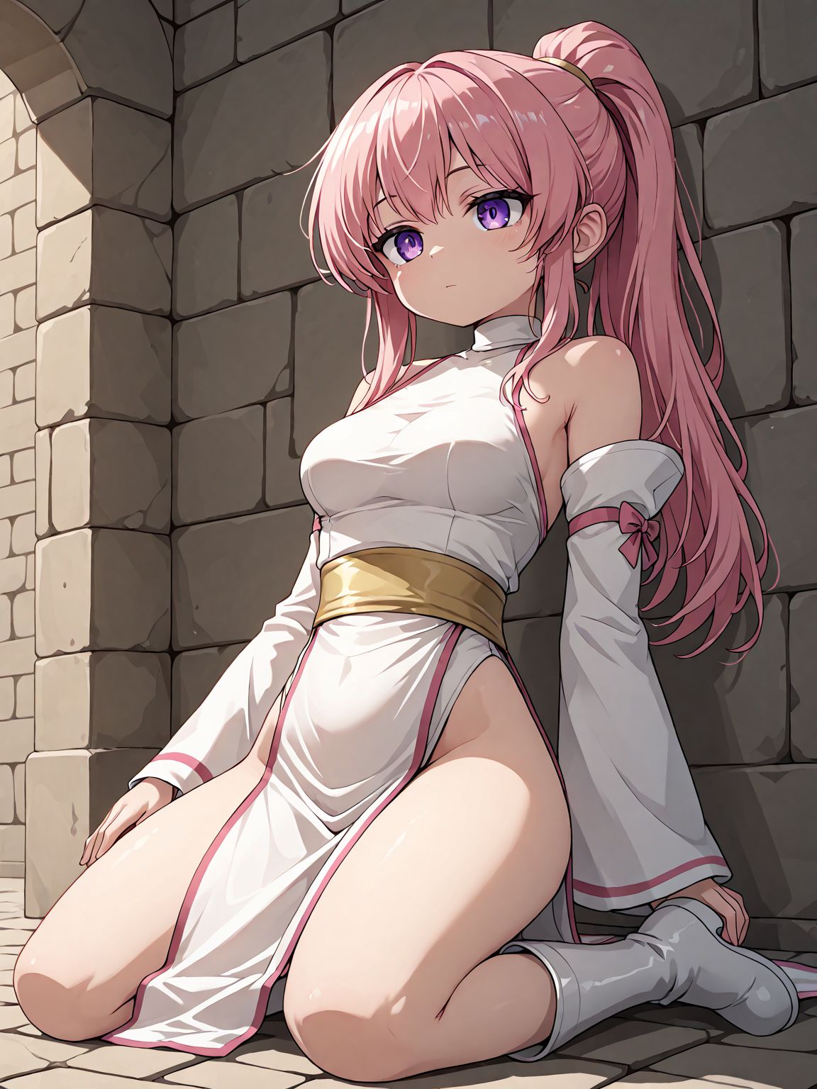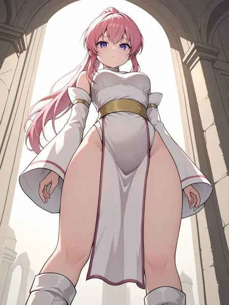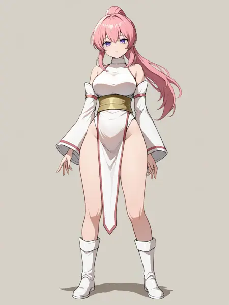 골반 커튼, 허리띠, 긴 소매, 분리된 소매, 넓은 소매, 드레스, 흰 드레스, 부츠, 흰 부츠,