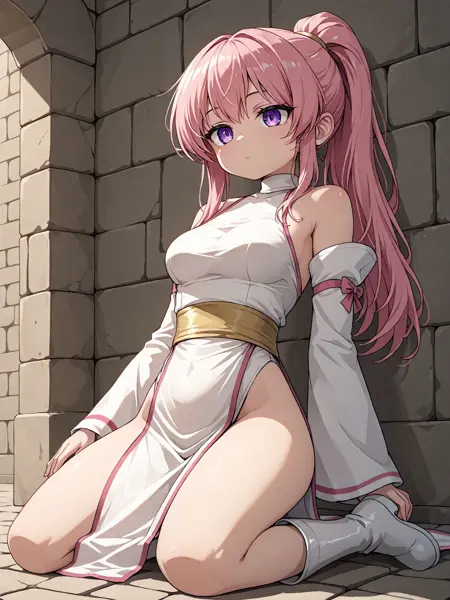 ピンクの髪、ポニーテール、長い髪、紫の目、