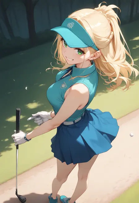 트리거 외에 golf club, gloves, outdoors, day 등을 추가하면 더욱 자연스러워지며, 여성 골퍼의 복장이라면 shirt, skirt, visor cap 등을 추가해 주세요.