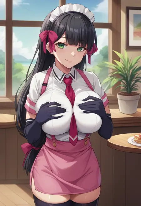 女仆头饰,发带,粉色领结,胸间,粉红丝带,白色衬衫,粉色吊带,肘部手套,黑色手套,超短裙,粉色裙子,粉色围裙,黑色过膝袜