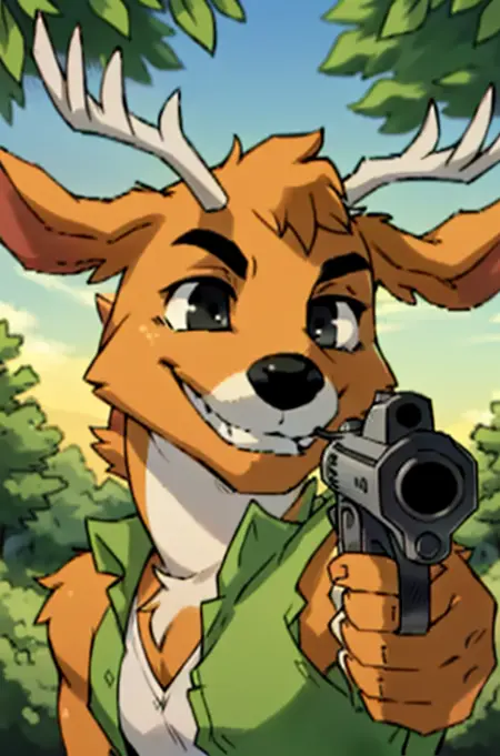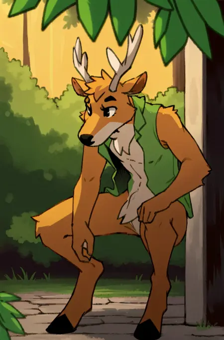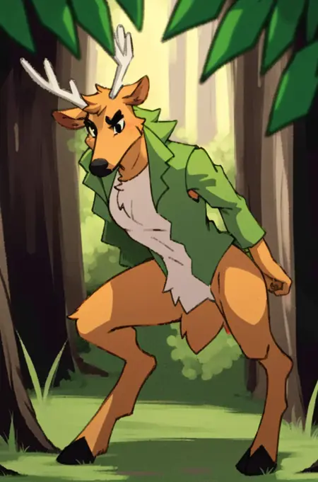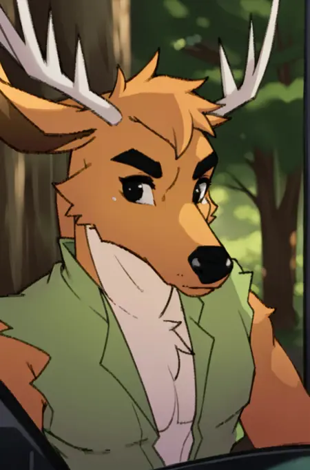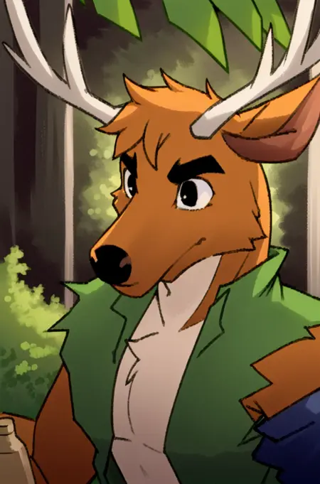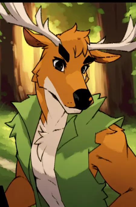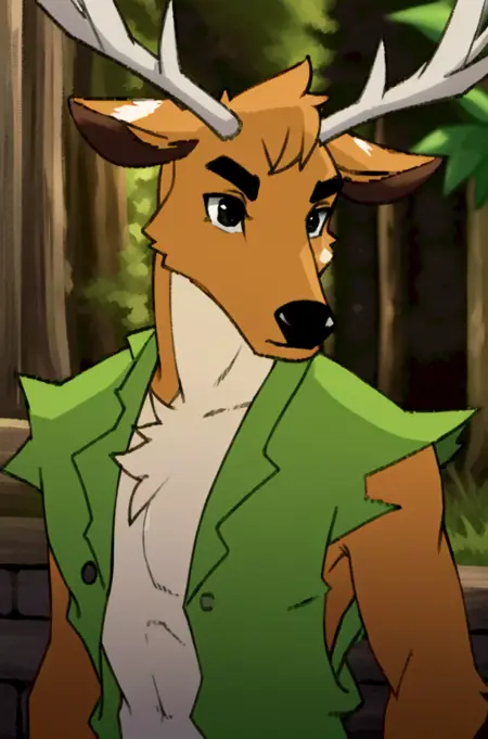 (찢어진 소매, 녹색 오픈 베스트, 가슴 털, 뿔, 사슴 귀, 코, 검은 눈)
