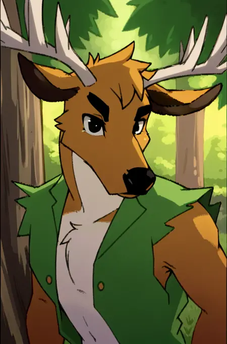 (撕裂的袖子,绿色敞开背心,胸部毛簇,鹿角,鹿耳朵,长鼻,黑眼睛)