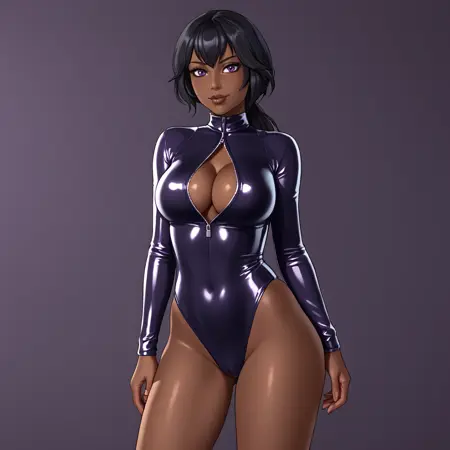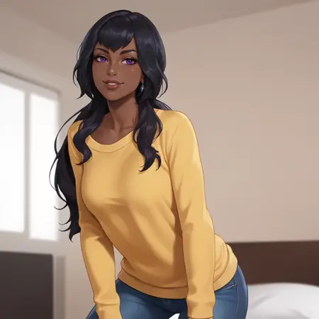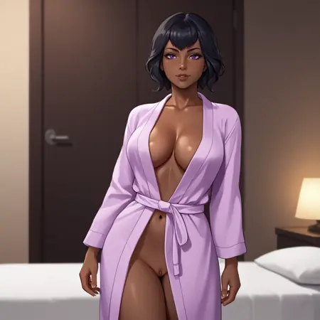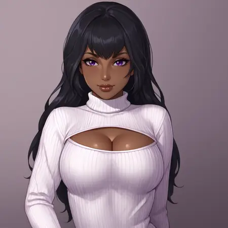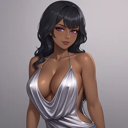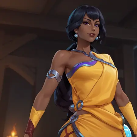 트리거: nilah, 1girl, 매우 짙은 피부, 검은 피부 여성, 귀걸이, 보석, 검은 머리, 보라색 눈, 드레스, 입술, 팔찌, 네일 폴리시, 손가락 없는 장갑, 어깨 노출
