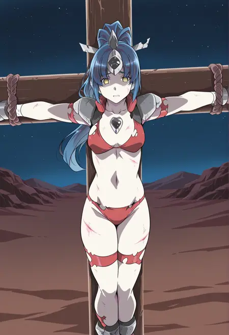 服装: 蓝色胸饰、蓝色额饰、红色比基尼、银色肩甲、手镯、大腿绑带、踝靴