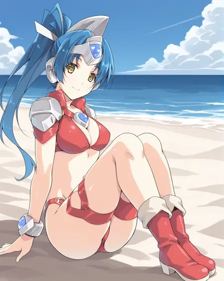 Clothes : blue chest jewel,blue forehead jewel,red bikini,silver pauldrons,bracelet,thigh strap,ankle boots,
