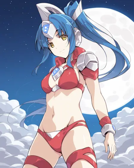 Trigger: UltraAlpha,blue hair,ponytail,yellow eyes,headgear,medium breasts,chest jewel,