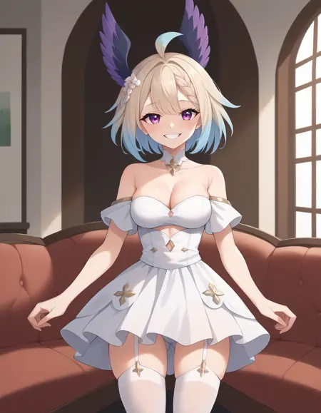 enna alouette, enna alouette (2nd costume), 1girl, solo, breasts, bangs, blonde hair, hair ornament, thighhighs, dress, cleavage, bare shoulders, blue hair, purple eyes, braid, flower, ahoge, multicolored hair, small breasts, detached sleeves, wings, hair flower, white dress, white thighhighs, gradient hair, garter straps, white flower, head wings, feathered wings, purple wings