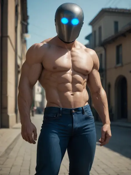 Isaacrobot, blue eyes, helmet, glowing eyes, belt, humanoid robot, boots,