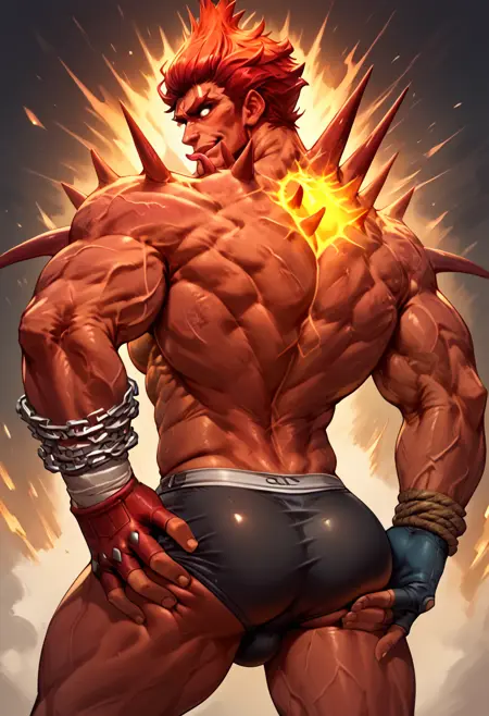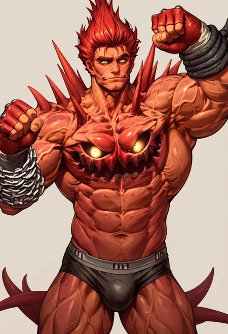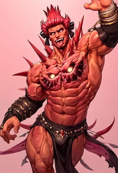 触发词:"bb0m, 厚眉毛, 尖刺, 红色皮肤, 静脉, 侧鬓, 发光, 胸部面部, 白色瞳孔" 始终需要以确保准确性。