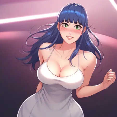 ((아름다운 섹시한 민소매 흰색 드레스, 탐스러운 가슴선, 거대한 가슴선, )) 갈색 팬티,
