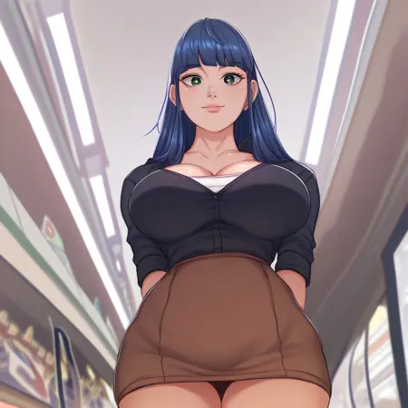 ((섹시한 어깨 노출 긴 소매 카디건, 섹시한 파란색 펜실 스커트, )) 섹시한 짧은 소매 어깨 노출 흰색 상의, 섹시한 흰색 팬티, 흰색 하이힐,