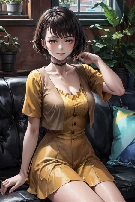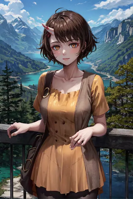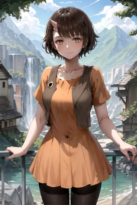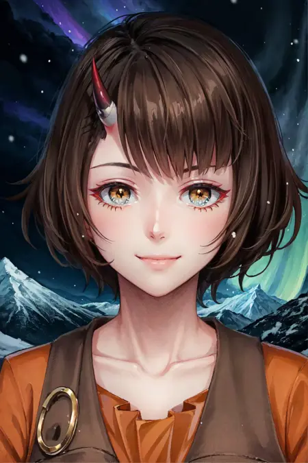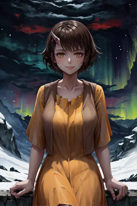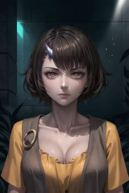 옵션: 단일 뿔, 짧은 드레스, 커팅된 베스트, 이빨, 오렌지색 눈