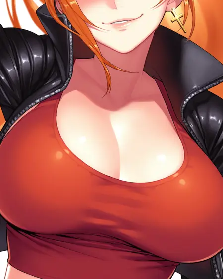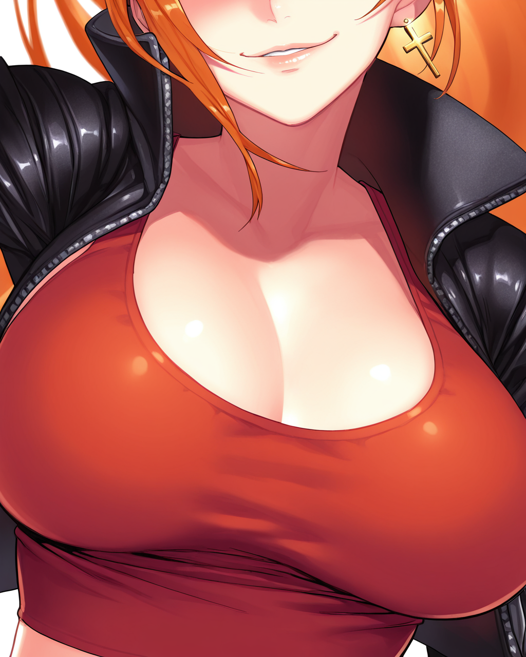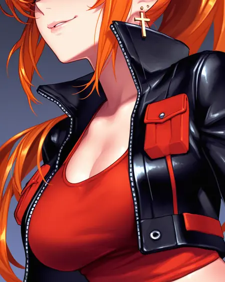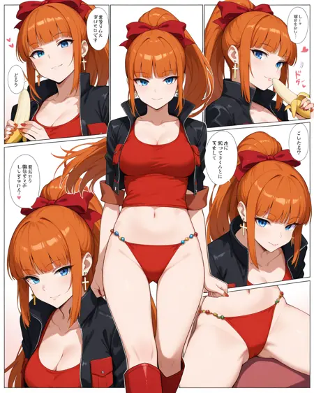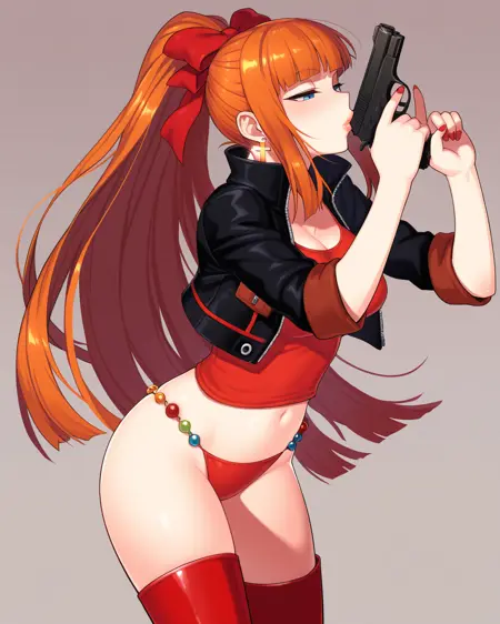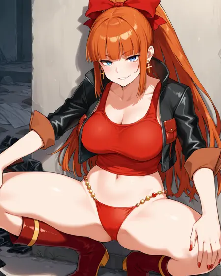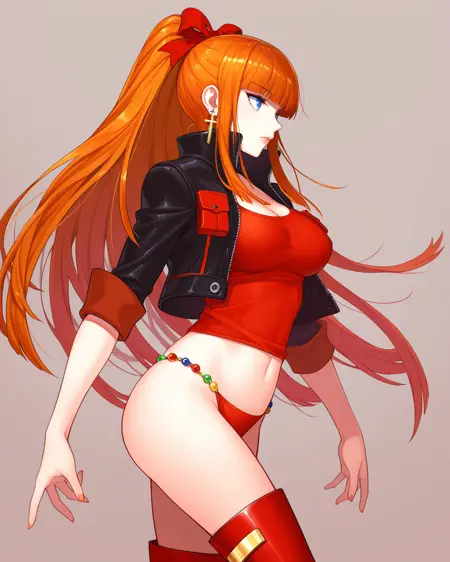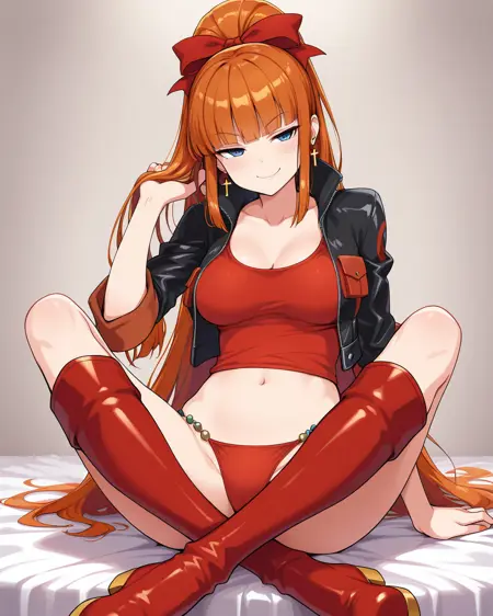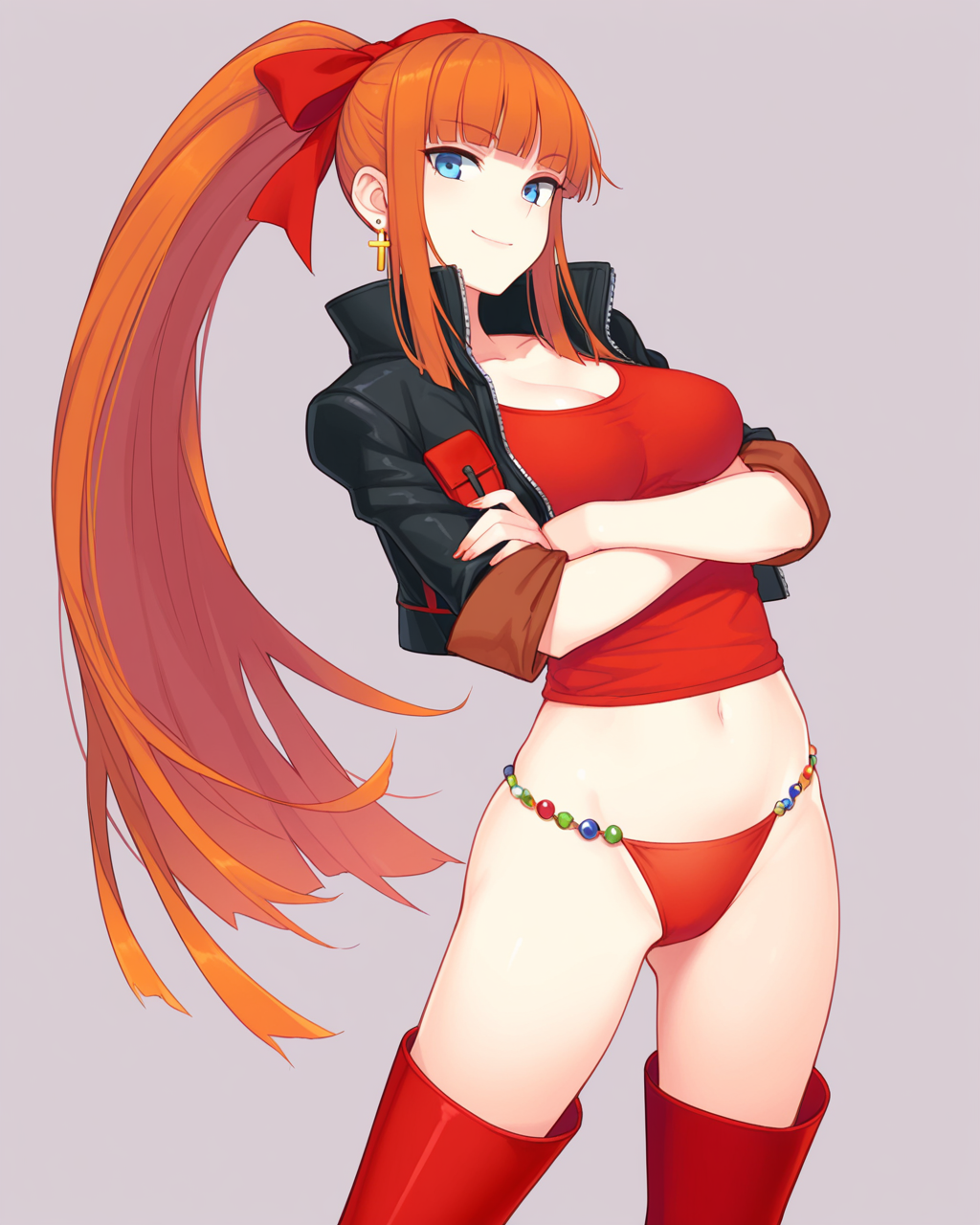 1girl, solo, rei_pt, blue eyes, blunt bangs, long hair, ponytail, red hair ribbon, red tank top, cleavage, red thong, beaded thong tie, leather jacket with red trim, midriff, navel,high collar, rolled sleeves, red boots