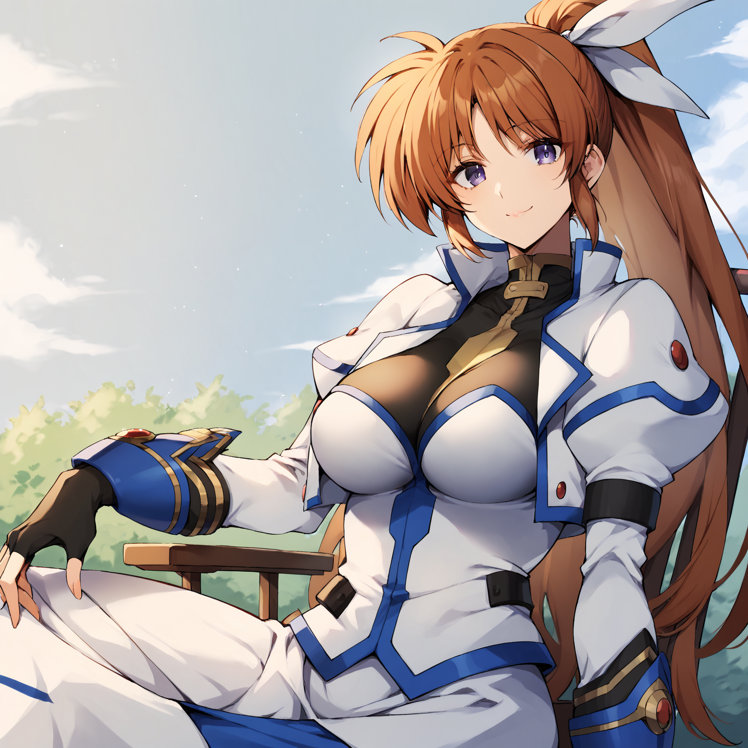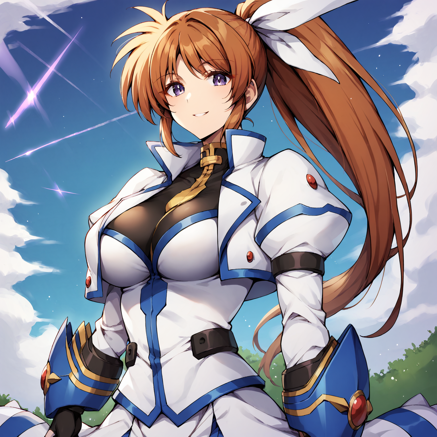 NanohaExceed、长发、裙子、棕发、长袖、连衣裙、丝带、马尾、紫眼、发带、露指手套、魔法少女、白色丝带、短款夹克