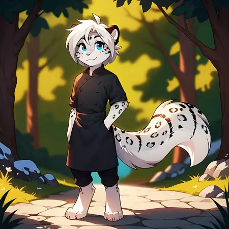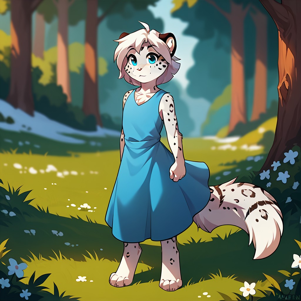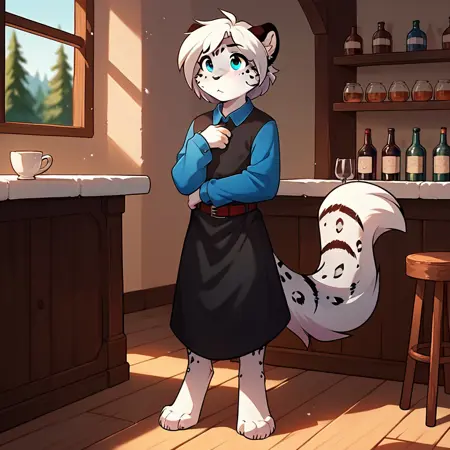 maevetk, anthro, female, snow leopard, young, blue eyes, white hair, ahoge,black dress, blue collar, blue sleeves, long sleeves