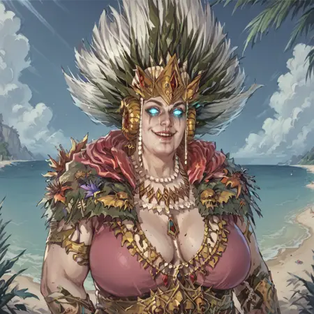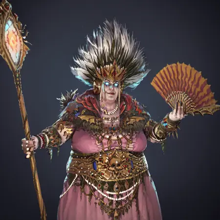 CylostraDirefin, glowing eyes, necklace, bracelet, crown, holding fan, holding staff