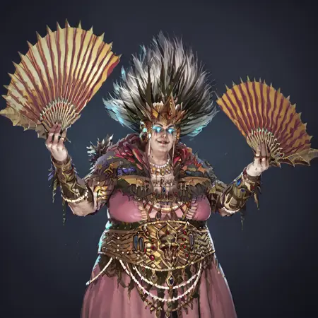 CylostraDirefin, glowing eyes, necklace, bracelet, crown, holding fan, holding staff