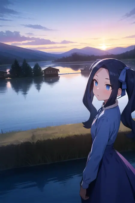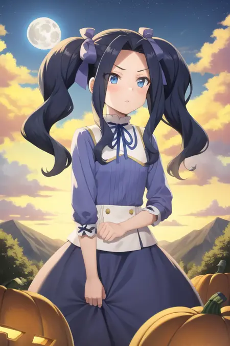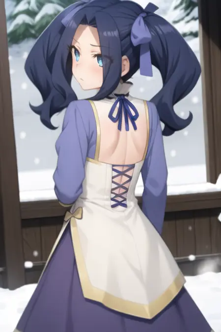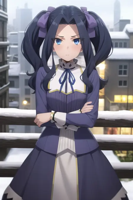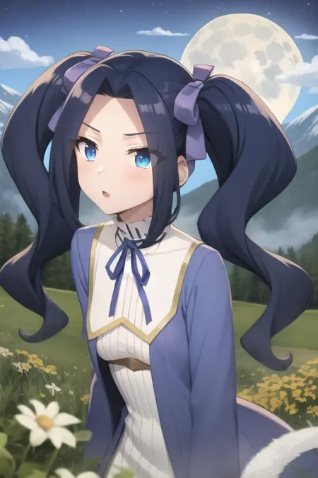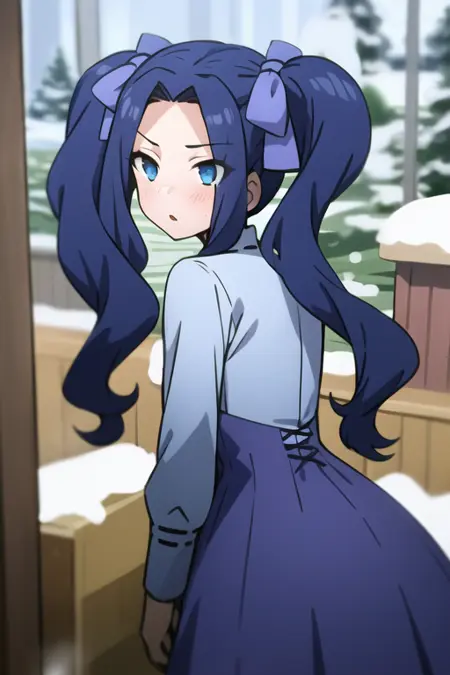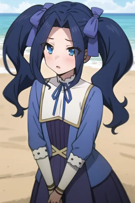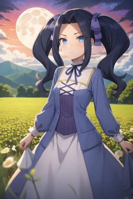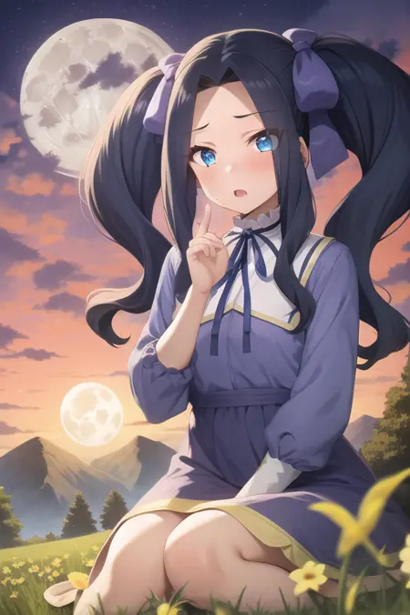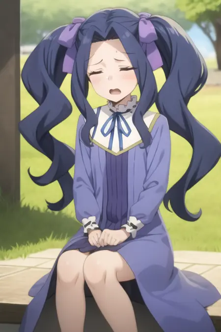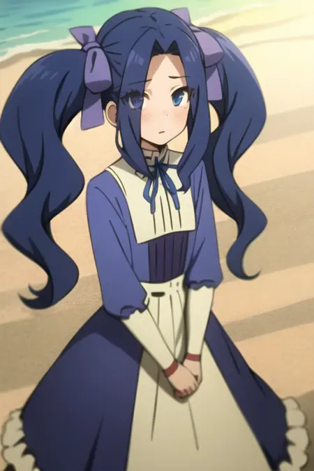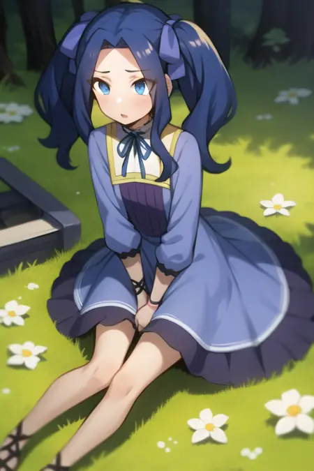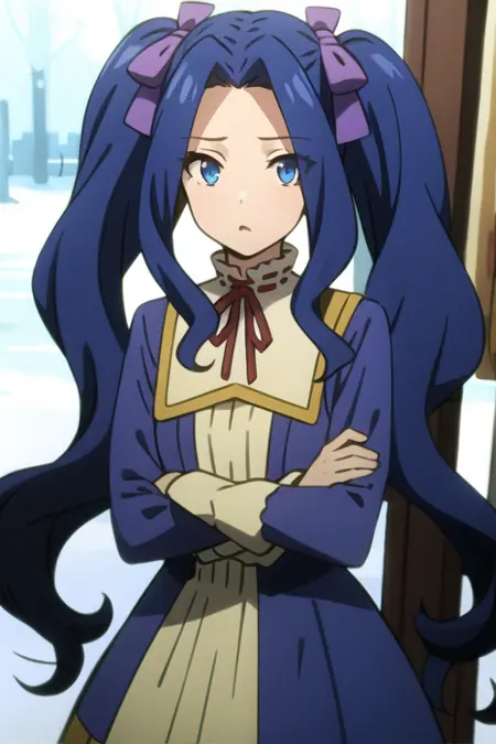 <lora:sh_melty:1> melty, 1girl, blue eyes, eyes visible through hair, hair intakes, bangs, purple hair, bangs, forehead, very long hair, twintails, parted bangs, hair bow, hair ribbon, dress, long sleeves, blue dress, neck ribbon,