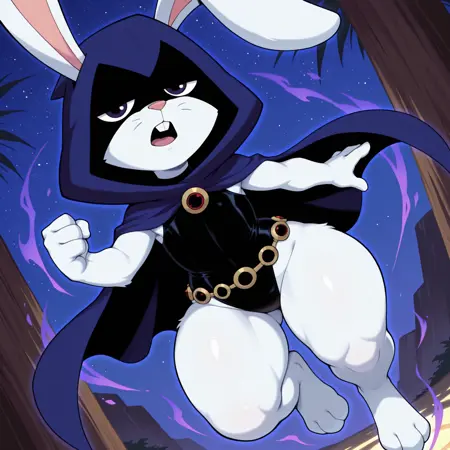 对于 Pony 版本:来自《少年泰坦》的 Raven,但这是她在剧集《如何让一只泰坦动物消失》中被 Mumbo 变成兔子后的形态。