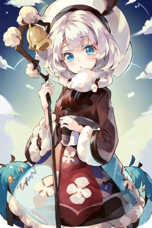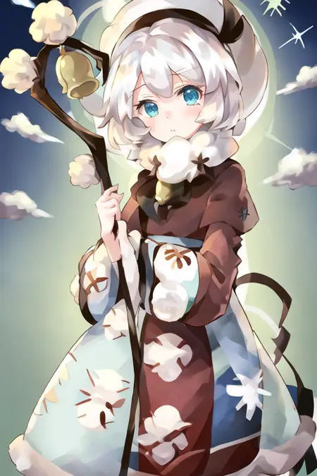 彼女を召喚するには crkcotton を使用してください。頭部を作るには ブルーアイズ、ショートヘア、ホワイトヘア、ハット を使用してください。ドレスを召喚するには ドレス、ロングスリーブ を使用してください。スタッフを召喚するには スタッフ、ベル を使用してください。