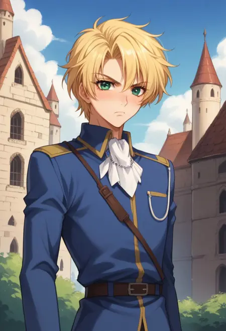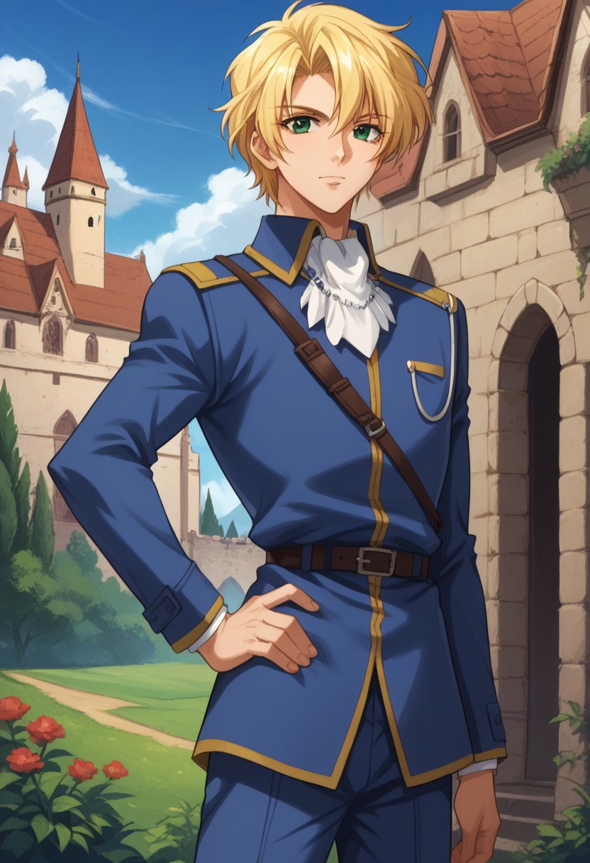 wolfram, solo, blonde hair, uniform, 1boy, male focus, military uniform, boots, military,