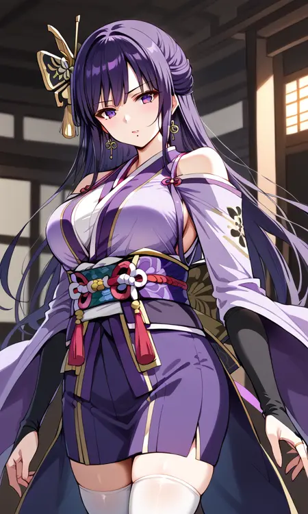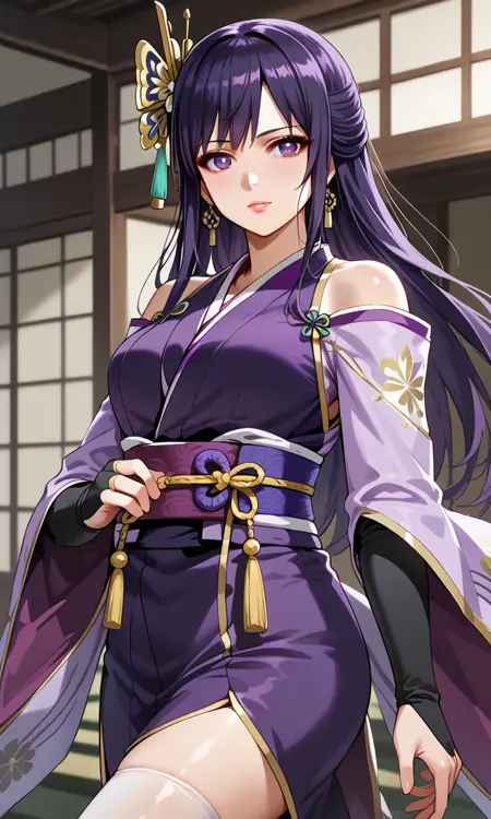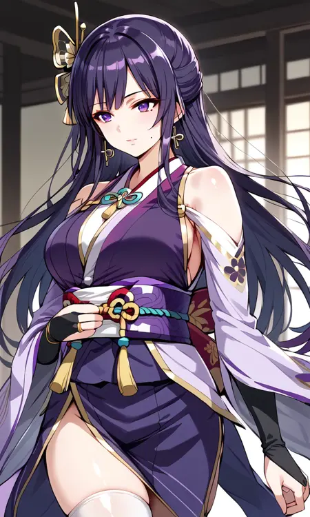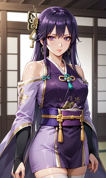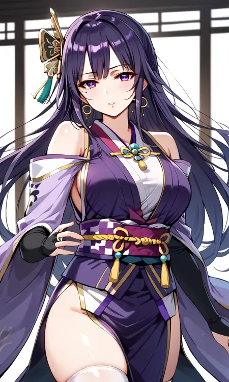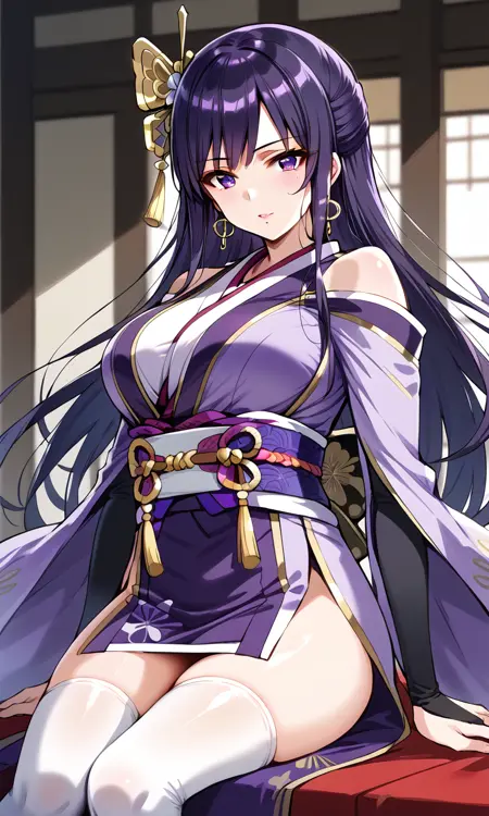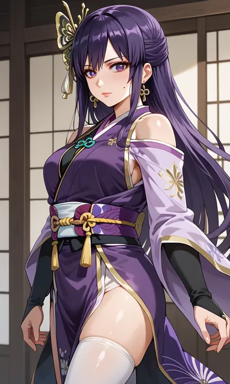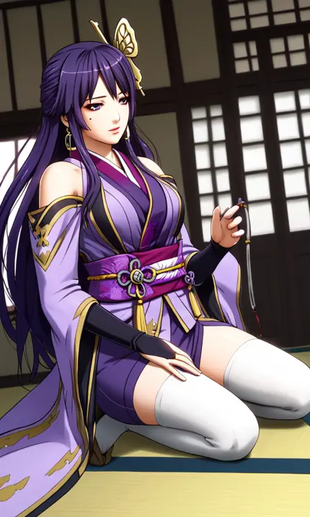 Nohime, long hair, dark purple hair, white thighhighs, japanese clothes, purple kimono, bare shoulder, beauty mark, bridal gauntlets, earrings, purple eyes, sash