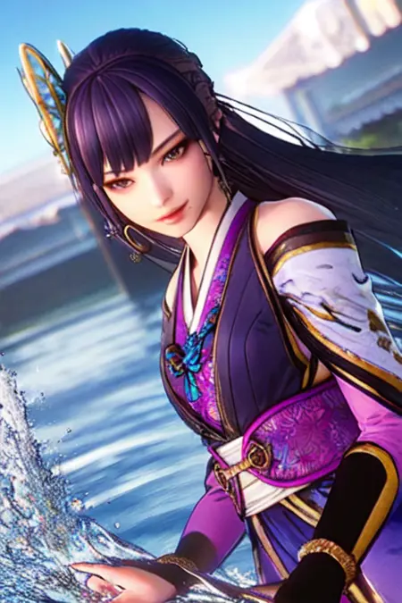 Nohime, long hair, dark purple hair, white thighhighs, japanese attire, japanese clothes, purple attire, bare shoulder, mole, bridal gauntlets, earrings, dark purple eyes, sash
