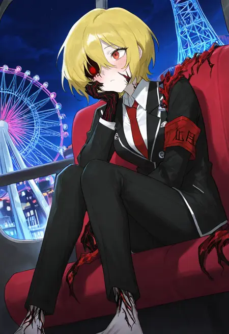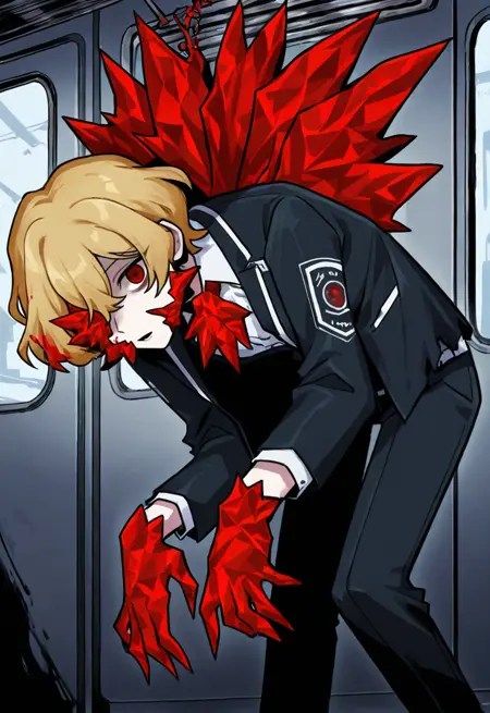 BloodfiendsHalf, half face covered, black skin, bright red veins