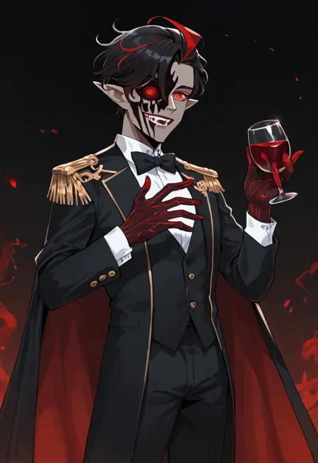 BloodfiendsHalf, half face covered, black skin, bright red veins