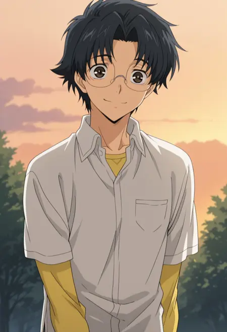 kenmurata, solo, 1boy, male focus, glasses, necktie, red necktie, school uniform, black hair, jacket, blazer, pants, long sleeves, shoes,
