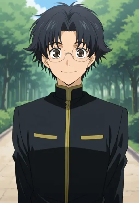 kenmurata, solo, 1boy, male focus, glasses, school uniform, black hair, gakuran, pants, black pants, long sleeves,