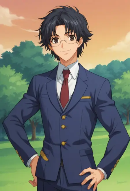 kenmurata, solo, 1boy, male focus, glasses, necktie, red necktie, school uniform, black hair, jacket, blazer, pants, long sleeves, shoes,