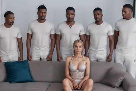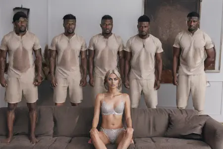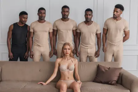 lora:gngsfimFT15:{0.6|0.7|0.8|0.9|1}, {gngsf, }{1girl, }{sitting, }{multiple boys, }{facial hair, ||}{dark-skinned male, }{5boys, }{male underwear, ||}{beard, ||}{white male underwear, ||}{6+boys, }{realistic, }{bulge, }{on couch, ||}{indian style, ||}{looking at viewer, ||}{briefs, ||}{muscular, ||}{mustache, |||}{erection, |||}{boxers, |||}{muscular male, |||} {A woman is sitting on a couch. She is wearing a shirt and has long hair. There are five men standing behind her. They are all wearing shorts. They all have no shirts on., boxer briefs, open mouth, |}