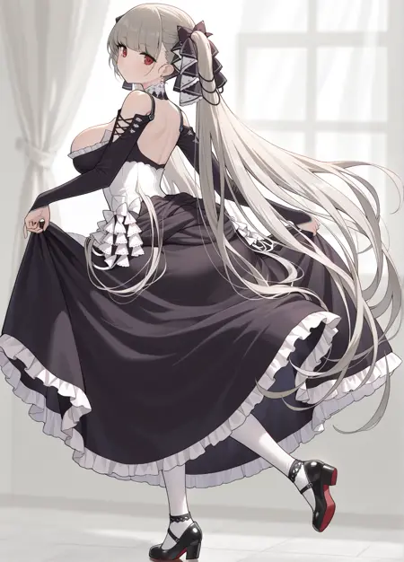 原版(original):formidable_\(azur_lane\), long_hair, twintails, red eyes, frilled dress, two-tone dress, breasts, large breasts,