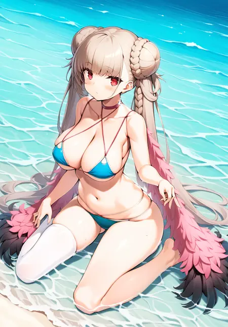 海边的“皇家淑女”(the_lady_of_the_beach):formidable_\(azur_lane\), long_hair, twintails,red eyes,double_bun, hair_bun, braid,multi-strapped_bikini,blue bikini,criss-cross_halter, choker, single_thighhigh,feather_boa,
