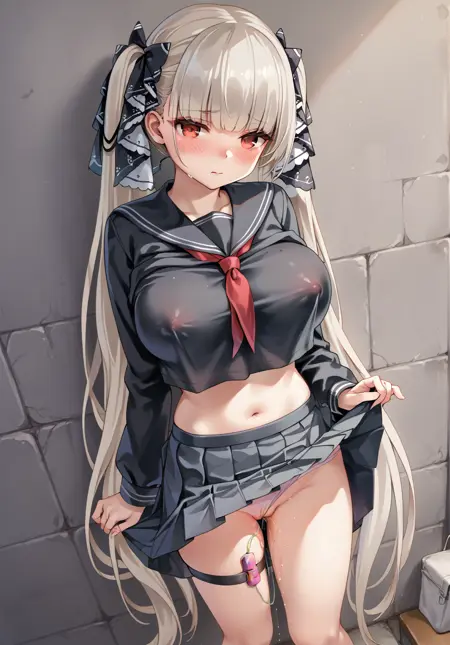 值日时的春心萌动(the_lover's_heart_flutters_on_duty):formidable_(azur_lane), long_hair, twintails, red_eyes, pleated_skirt, serafuku,