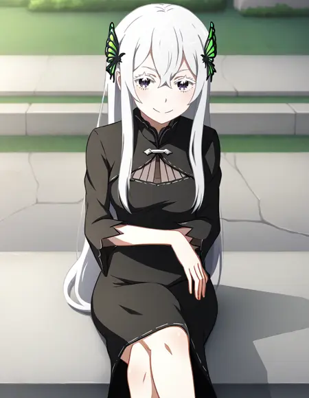主なキーワードは「Echidna ReZero」だけで、彼女の通常の特徴(白髪、長髪など)は自動的に反映されるため、追加で説明する必要はありません。