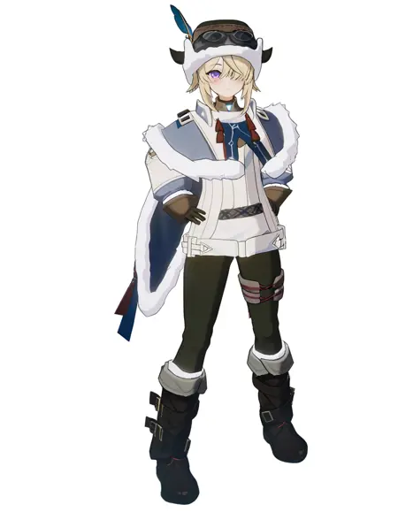 shanduola,1girl,solo,blonde hair,hair over one eye,purple eyes,hat,jacket,white jacket,bangs,brown headwear,goggles,brown gloves,fur trim,long sleeves,feathers,mole under eye,