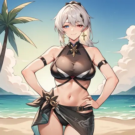 Kuni_Swimsuit, 髪の装飾, 交差型ピアス, 黒いビキニ, 白いビキニ, 透けたサロング, ツートーンサロング, 黒いベルト, 腕ストラップ, 脐, 覆われた乳房,