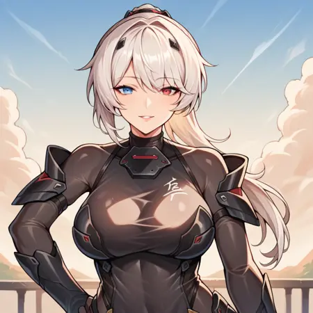 KuniAG, Knt_Def, 白髪, 青い目, 赤い目, 異色瞳, ポニーテール, 透けている骨盤カーテン, ボディスーツ, 透け感, 黒いボディスーツ, 黒いレオタード, アーマードレオタード, 交差ストラップ, アーマー, アーマードレッグウェア, 黒いハイソックス, 脚のカットアウト, アーマードスリーブ, 肩アーマー, 不対称スリーブ, 黒い袖, 脐のカバー, アーマードカラー, 髪の装飾, 腕ストラップ, 灰色のガントレット, ガーターストラップ, アーマードブーツ, ハイヒールブーツ, ヘッドギア,