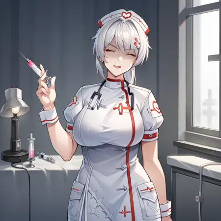 KuniAG, Knt_Nrs, 白髪, 青い目, 赤い目, 異色瞳, ポニーテール, 聴診器, 看護師, 白いドレス, 短いドレス, フリル付き短い袖, 白いパントイーズ, 太ももバンドパントイーズ, 太ももポーチ, 手首カフス, 赤いトリム, 看護師帽, ハートプリント, 白い靴, ハイヒール, ヘアクリップ,