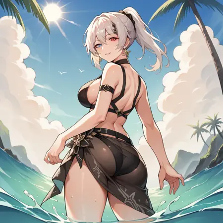 KuniAG, Knt_Swm, 白髪, 青い目, 赤い目, 異色瞳, ポニーテール, サングラス, 頭にかけた眼鏡, 黒いビキニ, レイヤードビキニ, 黒いサロング, 黒いベルト, ベルトのバックル, 太ももベルト, Oリングストラップ, 腕ストラップ, 透けた胸元, ハルタネック, 首リボン, ペンダント, ジュエリー, ピアス, 手首ストラップ, ハイヒールサンダル, ストラップハイヒール, xヘアクリップ, 白いトリム, ビキニ, 水着,