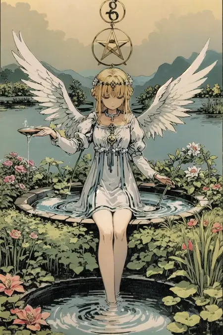 temperanceangelwingsholding cupspond of waterXV – The Devil: