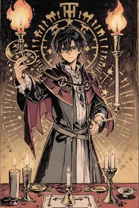 the magicianmanrobescandle/holding candletable with itemsstarpentaclecupswordwandII – The High Priestess: