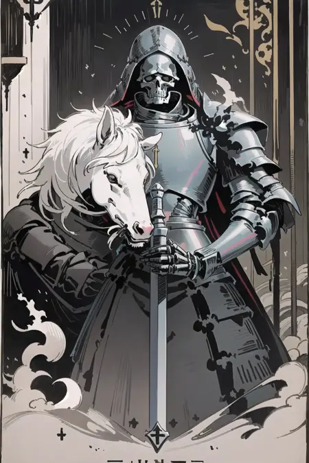 deathskeleton knightblack armorwhite horseflagwarXIV – Temperance: